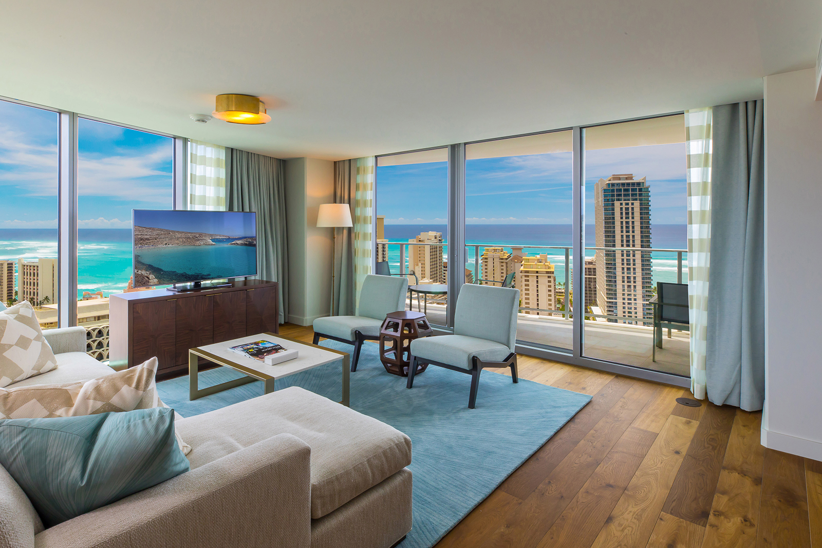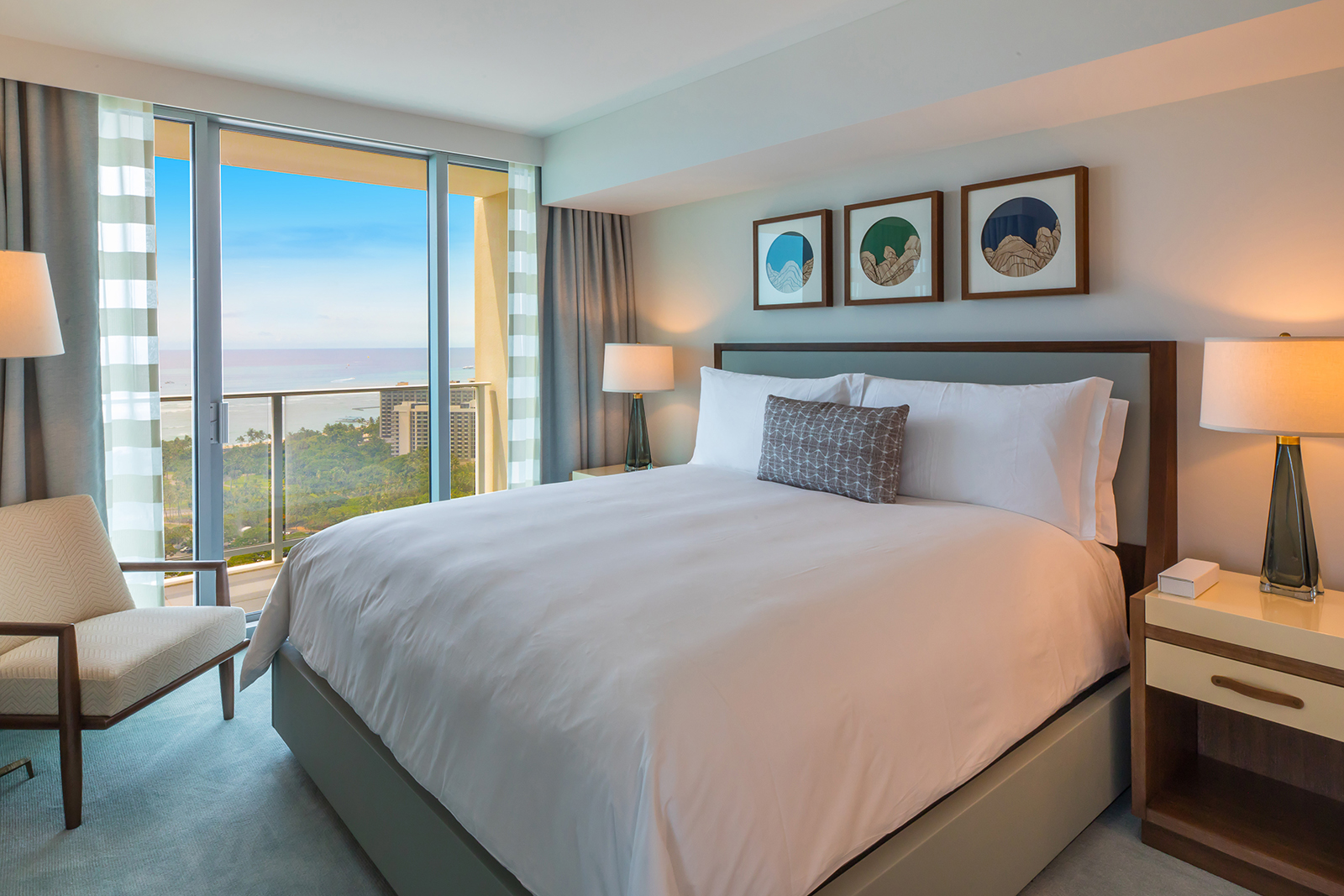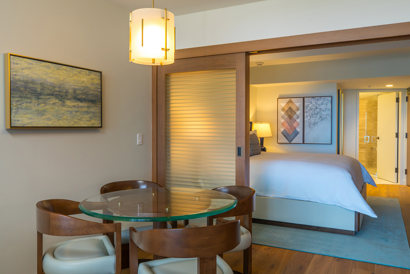 This Waikiki hotel boasts exquisite finishes such as solid walnut, burnished brass and Volakas white stone. Walnut veneers and solids work to tie together the grand lounge chairs, which have Robert Allen Fame linen. Custom-painted drawer fronts are finished with leather and burnished brass pulls.