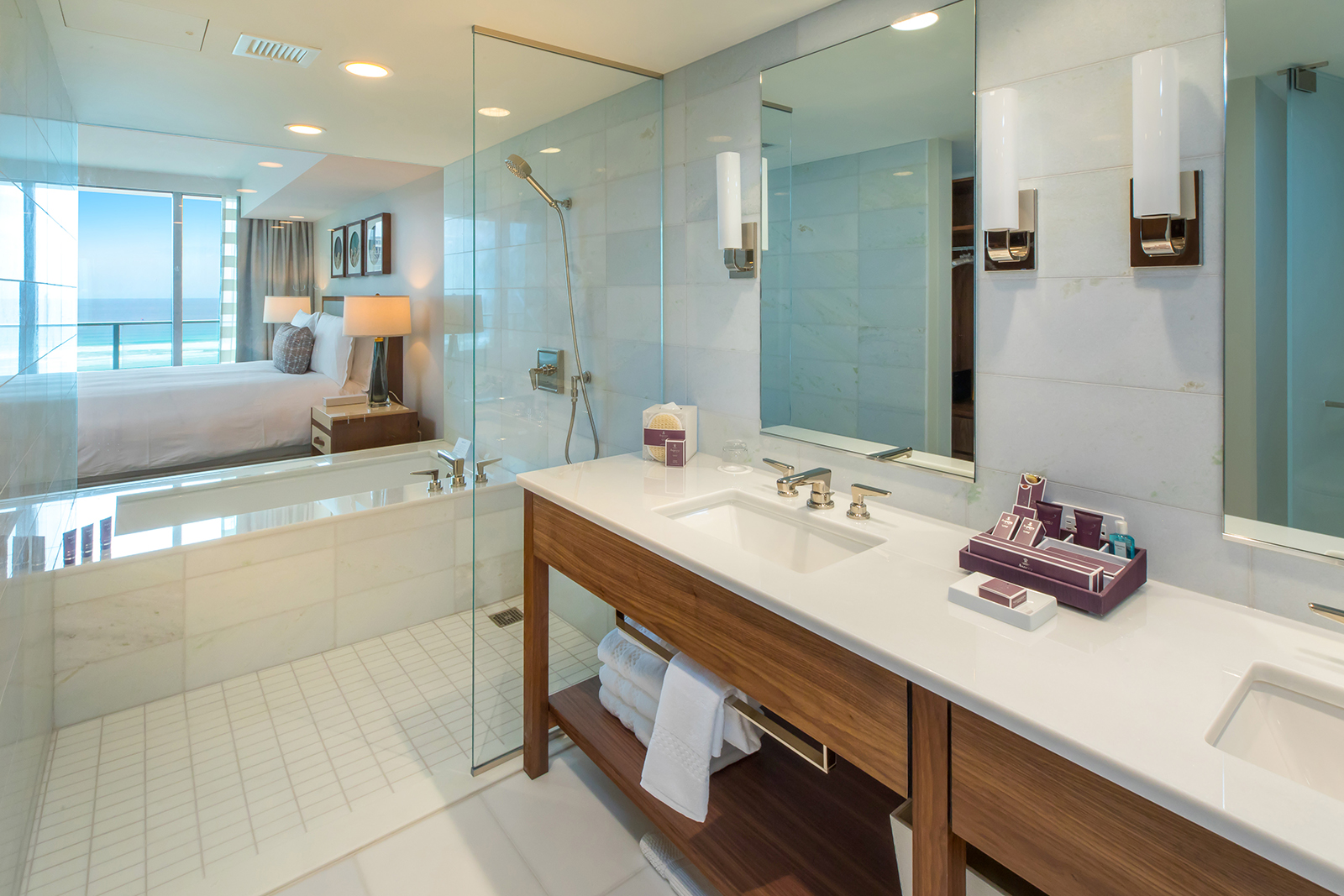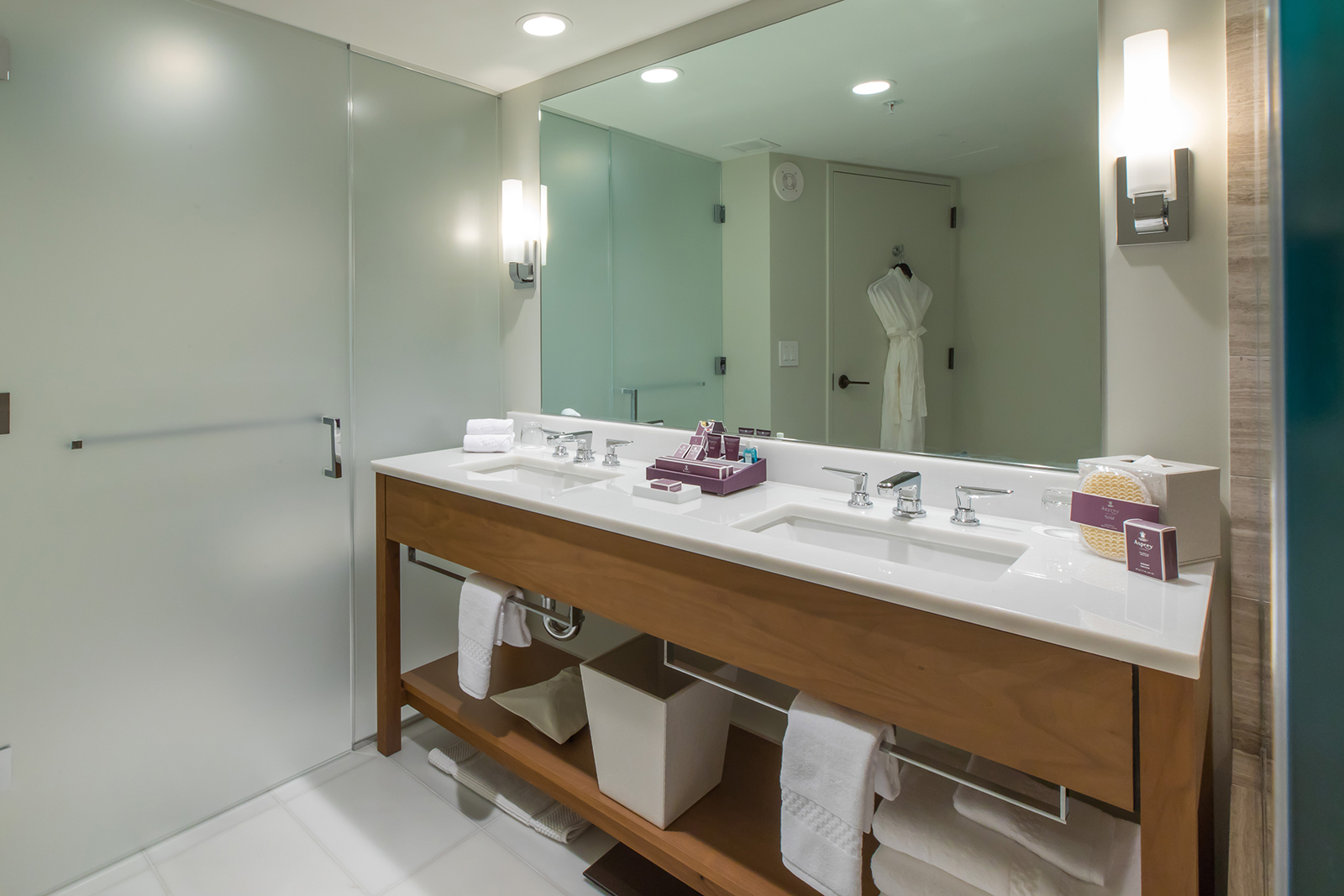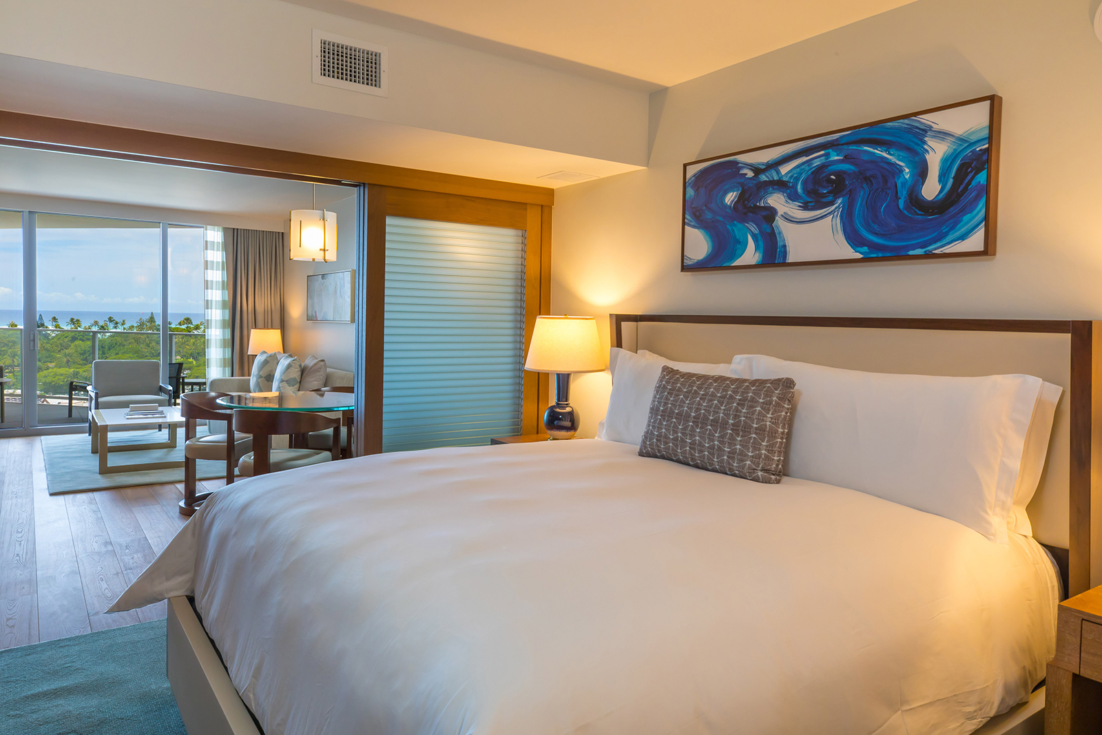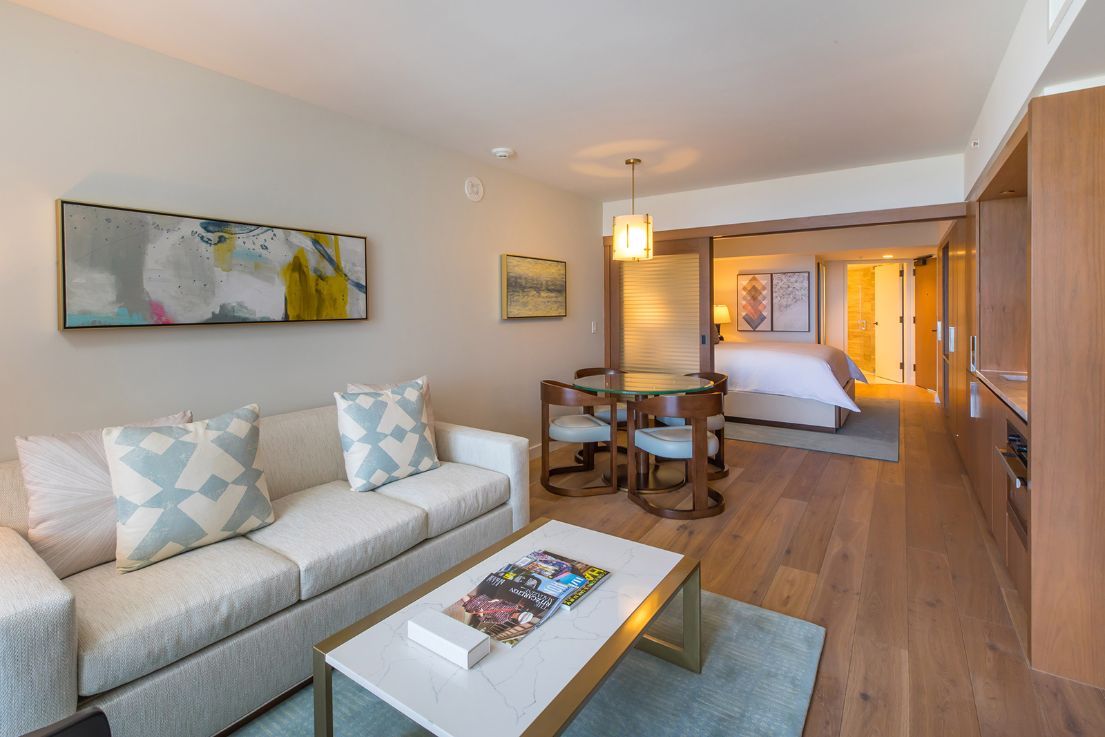 This Waikiki hotel boasts exquisite finishes such as solid walnut, burnished brass and Volakas white stone. Walnut veneers and solids work to tie together the grand lounge chairs, which have Robert Allen Fame linen. Custom-painted drawer fronts are finished with leather and burnished brass pulls.